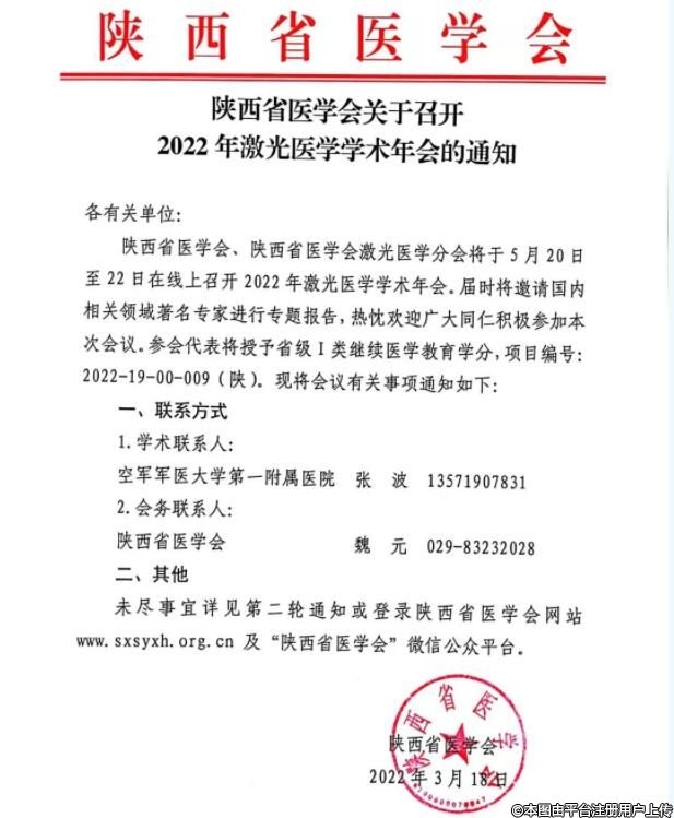 陜西省醫(yī)學(xué)會(huì)、陜西省醫(yī)學(xué)會(huì)激光醫(yī)學(xué)分會(huì)將于5月20日至22日在線上召開(kāi)2022年激光醫(yī)學(xué)學(xué)術(shù)年會(huì)。屆時(shí)將邀請(qǐng)國(guó)內(nèi)相關(guān)領(lǐng)域著名專家進(jìn)行專題報(bào)告,熱忱歡迎廣大同仁積極參加本次會(huì)議。參會(huì)代表將授予省級(jí)I類(lèi)繼續(xù)醫(yī)學(xué)教育學(xué)分,項(xiàng)目編號(hào):2022-19-00-009(陜)?,F(xiàn)將會(huì)議有關(guān)事項(xiàng)通知如下: