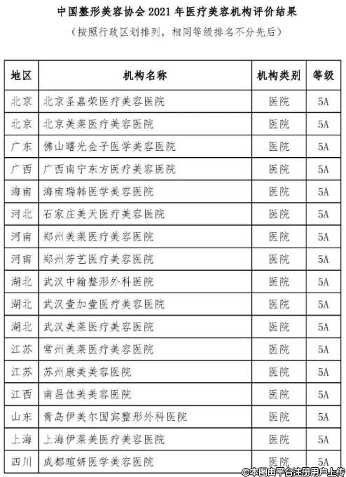 2021年中國(guó)整形美容協(xié)會(huì)組織對(duì)北京等16個(gè)省市區(qū)的56家醫(yī)療機(jī)構(gòu)開展了評(píng)價(jià)工作。經(jīng)資格審查、現(xiàn)場(chǎng)初評(píng)、現(xiàn)場(chǎng)復(fù)評(píng)、評(píng)價(jià)結(jié)果向社會(huì)公示一周無異議等程序,現(xiàn)將2021年醫(yī)療美容機(jī)構(gòu)評(píng)價(jià)結(jié)果公布如下。醫(yī)院類最高等級(jí)為5A,門診部類最高等級(jí)為4A,診所類最高等級(jí)為3A。名單見附件。