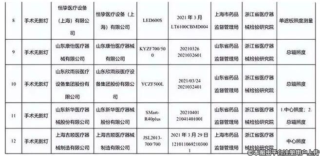 7臺手術無影燈分別為山東新華醫(yī)療器械股份有限公司、河北誼安奧美醫(yī)療設備有限公司、上海吉順醫(yī)療器械制造有限公司等7家企業(yè)生產(chǎn),涉及保護接地阻抗、中心照度、單遮板照度測量、總輻照度等不符合標準規(guī)定。