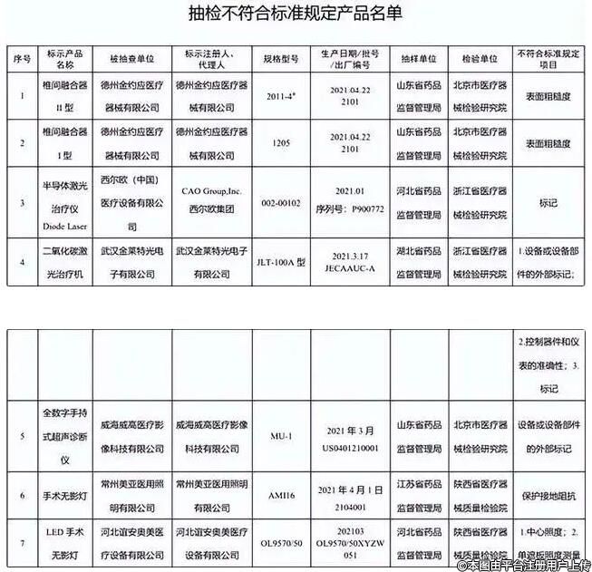 4月20日,國家藥監(jiān)局關于發(fā)布國家醫(yī)療器械監(jiān)督抽檢結(jié)果的通告,其中德州金約應醫(yī)療器械有限公司生產(chǎn)的椎間融合器2批次,表面粗糙度不符合標準規(guī)定;半導體激光治療機1臺:CAO Group,Inc. 西爾歐集團生產(chǎn)的半導體激光治療機標記不符合標準規(guī)定;武漢金萊特光電子有限公司生產(chǎn)二氧化碳激光治療機1臺外部標記、控制器件和儀表的準確性、標記不符合標準規(guī)定;威海威高醫(yī)療影像科技有限公司生產(chǎn)的手持式超聲診斷設備外部標記不符合標準規(guī)定。