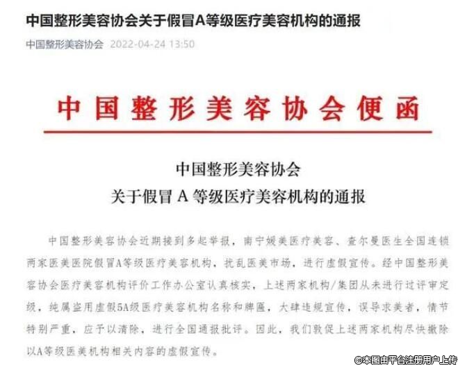 2022年4月24日,中國整形美容協(xié)會發(fā)布消息,南寧媛美醫(yī)療美容、查爾曼醫(yī)生全國連鎖兩家醫(yī)美醫(yī)院假冒A等級醫(yī)療美容機構(gòu),擾亂醫(yī)美市場,進行虛假宣傳。經(jīng)中國整形美容協(xié)會醫(yī)療美容機構(gòu)評價工作辦公室認真核實,上述兩家機構(gòu)/集團從未進行過評審定級,純屬盜用虛假5A級醫(yī)療美容機構(gòu)名稱和牌匾,大肆違規(guī)宣傳,誤導(dǎo)求美者,情節(jié)特別嚴重,應(yīng)予以清除,進行全國通報批評。