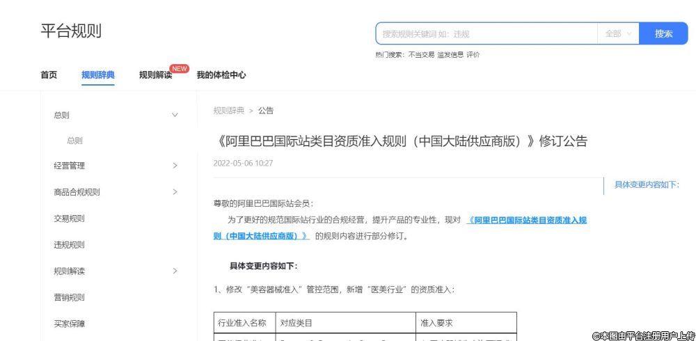 5月6日消息,今日,阿里巴巴國際站公布公告,對《阿里巴巴國際站類目資質(zhì)準入規(guī)則(中國大陸供應商版)》的規(guī)則內(nèi)容進行部分修訂,將于2022年5月12日起正式生效執(zhí)行。