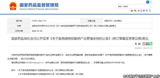 關于醫(yī)用透明質酸鈉產品管理類別的公告(修訂草案征求意見稿)