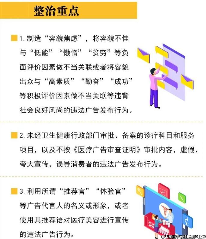 據(jù)了解,“清風行動”重點整治制造“容貌焦慮”,違背社會良好風尚的違法廣告發(fā)布行為;未經(jīng)衛(wèi)生健康行政部門審批、備案的診療科目和服務項目,虛假、夸大宣傳、誤導消費者的違法廣告發(fā)布行為;利用所謂“推薦官”“體驗官”等廣告代言人的名義或形象,或者使用其推薦語對醫(yī)療美容進行宣傳的違法廣告行為;使用行業(yè)協(xié)會、醫(yī)學權威機構等社會社團或組織及其人員的名義、形象,以及利用患者名義或者形象進行診療前后效果對比或者作證明的違法廣告發(fā)布行為;以介紹健康科普、養(yǎng)生知識、人物專訪、新聞報道、醫(yī)療資訊服務專題(欄)等形式變相發(fā)布違法廣告等行為。