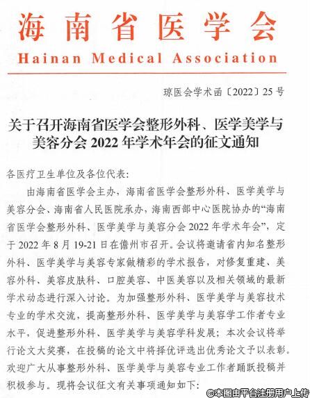 關(guān)于召開(kāi)海南省醫(yī)學(xué)會(huì)整形外科、醫(yī)學(xué)美學(xué)與美容分會(huì)2022年學(xué)術(shù)年會(huì)的征文通知