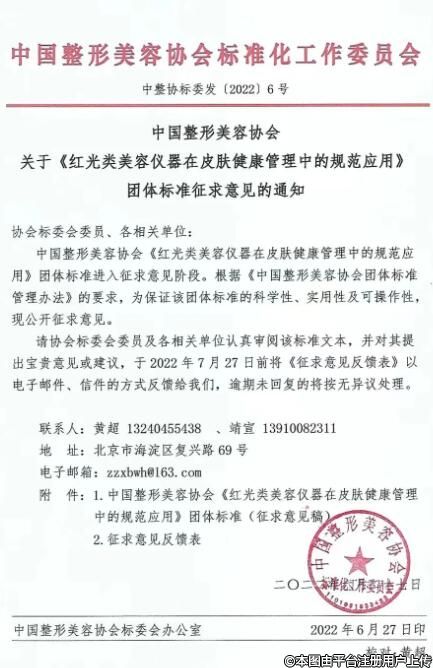 6月27日,中國(guó)整形美容協(xié)會(huì)發(fā)布關(guān)于《紅光類(lèi)美容儀器在皮膚健康管理中的規(guī)范應(yīng)用》團(tuán)體標(biāo)準(zhǔn)征求意見(jiàn)的通知,旨在更好的規(guī)范和引導(dǎo)紅光類(lèi)美容儀的應(yīng)用市場(chǎng),補(bǔ)充現(xiàn)有標(biāo)準(zhǔn)尚未對(duì)紅光類(lèi)美容儀器特有屬性的規(guī)范空缺。請(qǐng)協(xié)會(huì)標(biāo)委會(huì)委員及各相關(guān)單位認(rèn)真審閱該標(biāo)準(zhǔn)文本,并對(duì)其提出寶貴意見(jiàn)或建議,于2022年7月27日前將《征求意見(jiàn)反饋表》以電子郵件、信件的方式反饋。