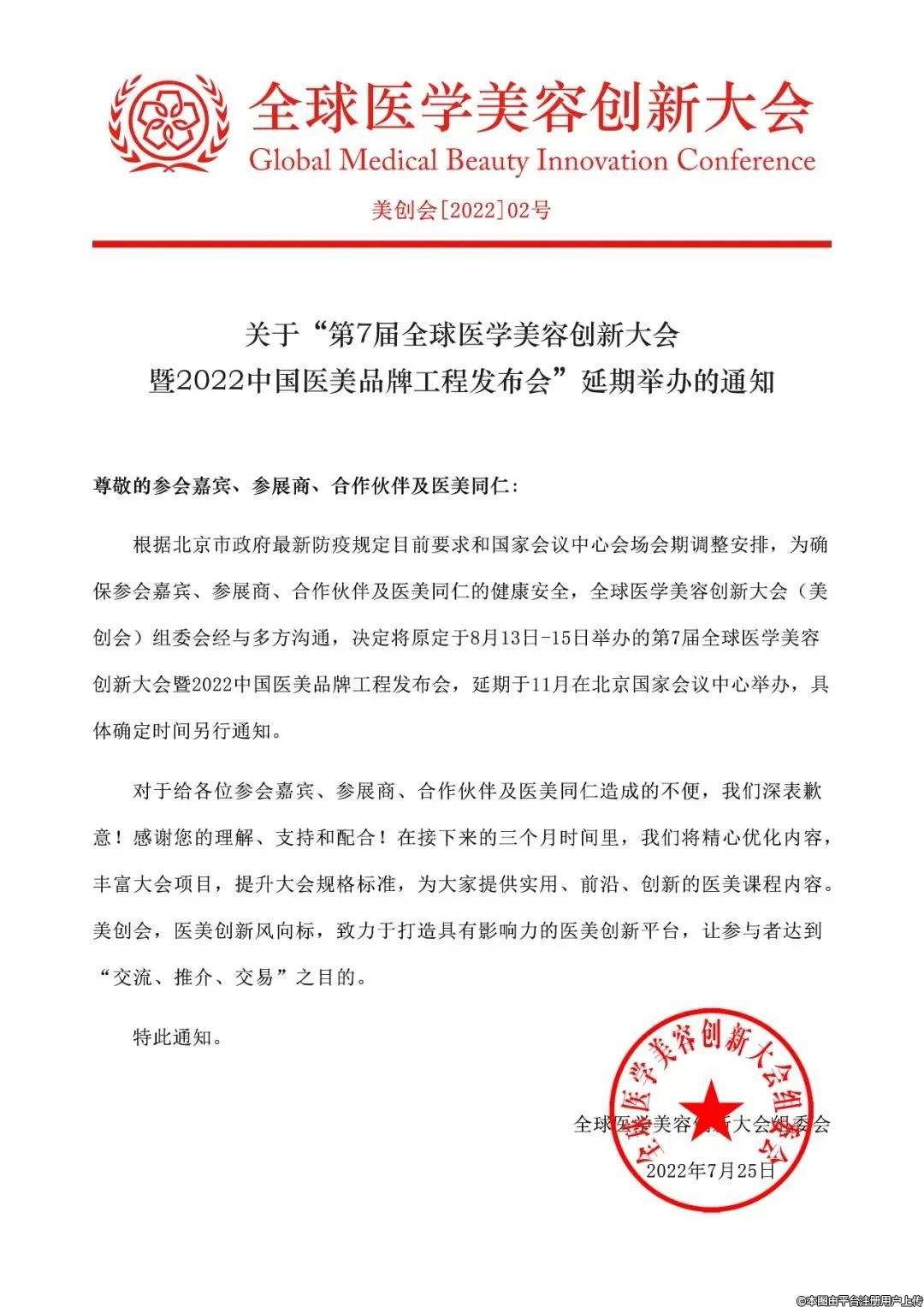 延期通知 第七屆全球醫(yī)學(xué)美容創(chuàng)新大會(huì)暨2022中國醫(yī)美品牌工程發(fā)布會(huì)