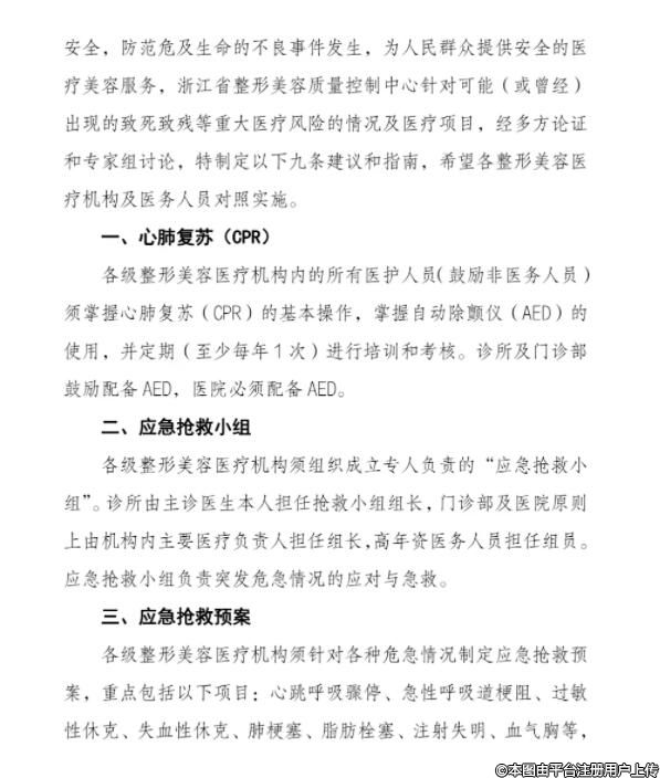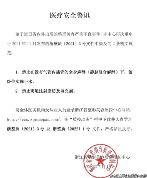 浙江省整形美容質(zhì)量控制中心發(fā)布《醫(yī)療安全警訊》,再次重申:1、禁止在沒有氣管內(nèi)插管的全身麻醉(靜脈復合麻醉)下,俯臥位實施手術;2、禁止陰道注射脂肪及填充劑。