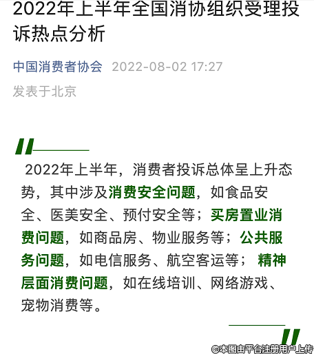 2022年上半年,消費(fèi)者投訴總體呈.上升態(tài)勢,其中涉及消費(fèi)安全問題,如食品安全、醫(yī)美安全、預(yù)付安全等;買房置業(yè)消費(fèi)問題,如商品房、物業(yè)服務(wù)等;公共服務(wù)問題,如電信服務(wù)、航空客運(yùn)等;精神層面消費(fèi)問題,如在線培訓(xùn)、網(wǎng)絡(luò)游戲、寵物消費(fèi)等。
