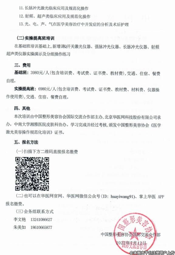 本次培訓(xùn)由中國(guó)整形美容協(xié)會(huì)國(guó)際交流合作部主辦,北京華醫(yī)網(wǎng)科技股份有限公司承辦,中南大學(xué)湘雅醫(yī)院皮膚科協(xié)辦。學(xué)習(xí)完成并經(jīng)過(guò)考核,頒發(fā)中國(guó)整形美容協(xié)會(huì)《醫(yī)學(xué)激光美容操作規(guī)范化培訓(xùn)》證書(shū)。