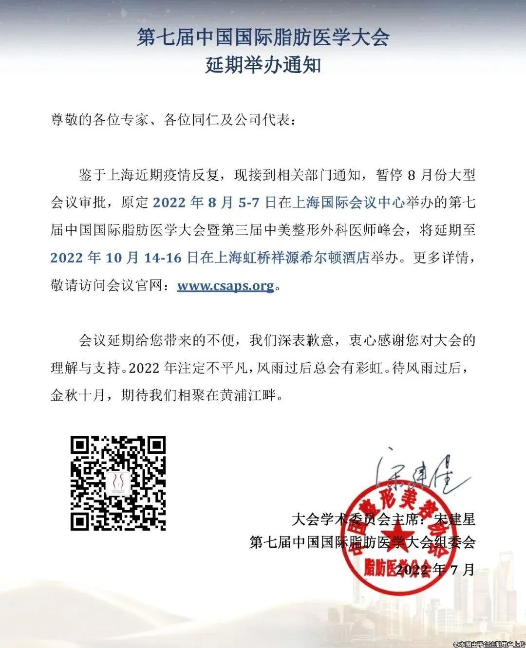 鑒于上海近期疫情反復(fù),原定2022年8月5-7日在上海國際會議中心舉辦的第七屆中國國際脂肪醫(yī)學(xué)大會暨第三屆中美整形外科醫(yī)師峰會,將延期至2022年10月14-16日在上海虹橋祥源希爾頓酒店舉辦。