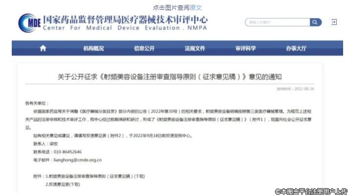 國(guó)家藥品監(jiān)督管理局醫(yī)療器械技術(shù)審評(píng)中心發(fā)布了《射頻美容設(shè)備注冊(cè)審查指導(dǎo)原則(征求意見(jiàn)稿)》(附件1),現(xiàn)面向社會(huì)公開(kāi)征求意見(jiàn),如有相關(guān)意見(jiàn)或建議,請(qǐng)?zhí)顚懛答佉庖?jiàn)表(附件2),于2022年9月18日前反饋至醫(yī)療器械技術(shù)審評(píng)中心。