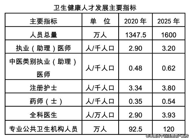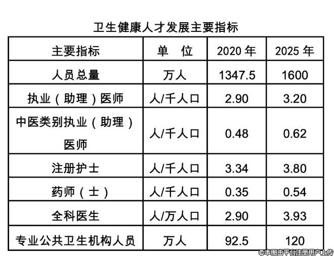 ——人才資源總量穩(wěn)步增長。到2025年,衛(wèi)生健康人員總量達到1600萬人,每千人口執(zhí)業(yè)(助理)醫(yī)師數(shù)達到3.20人(其中中醫(yī)類別0.62人)、每千人口注冊護士數(shù)達到3.80人、每千人口藥師(士)數(shù)達到0.54人,每萬人口全科醫(yī)生數(shù)達到3.93人,專業(yè)公共衛(wèi)生機構(gòu)人員數(shù)增長到120萬人。