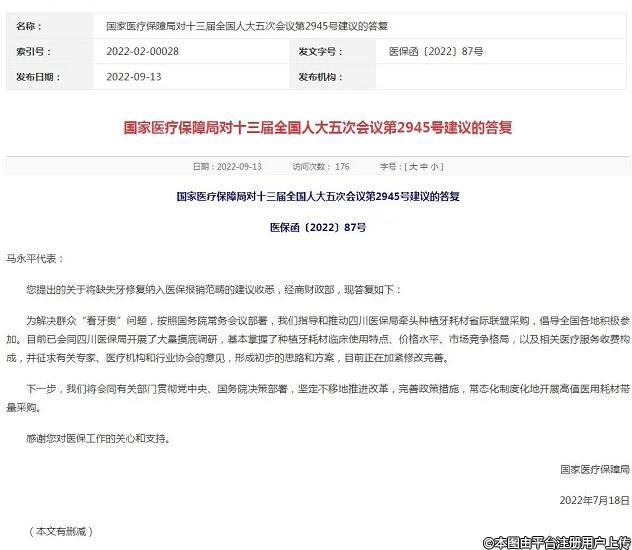 還記得去年有一個(gè)人大代表建議“將種牙納入醫(yī)保”,后面醫(yī)保局給出了回復(fù)。前幾天又有一個(gè)代表建議缺失牙修復(fù)納入醫(yī)保報(bào)銷,同樣也得到了答復(fù)。