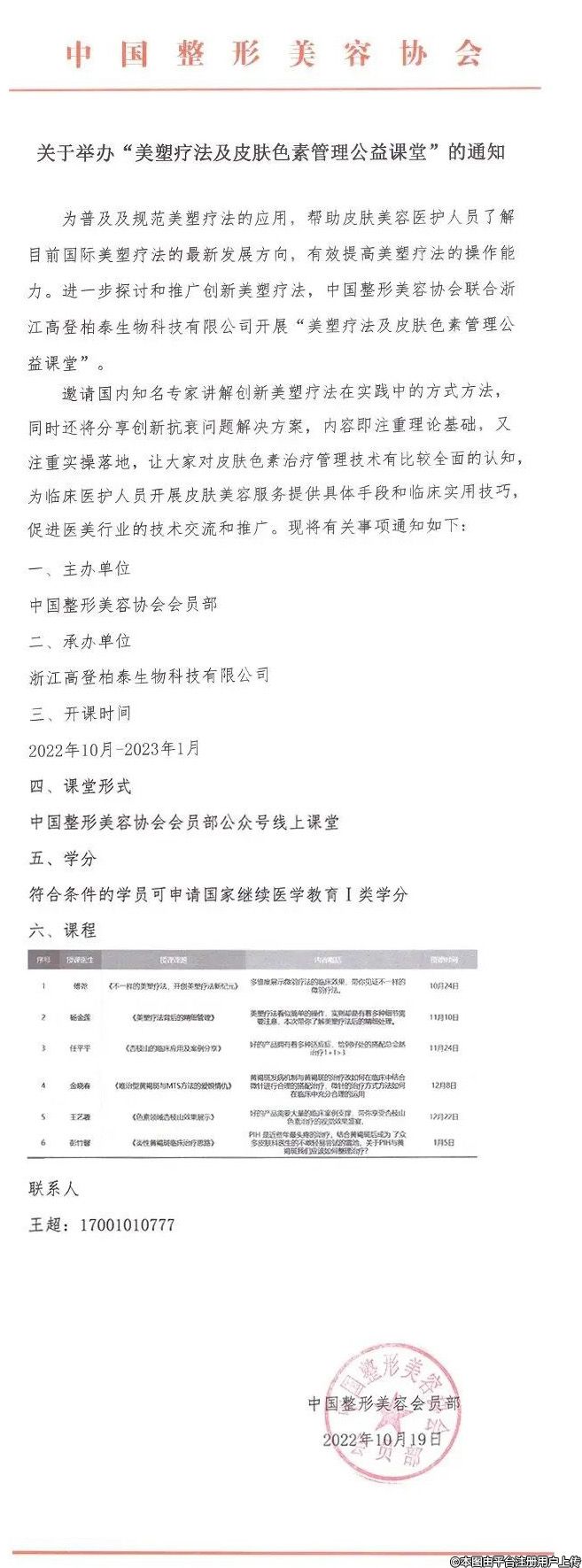 為普及及規(guī)范美塑療法的應(yīng)用,幫助皮膚美容醫(yī)護(hù)人員了解目前國(guó)際美塑療法的最新發(fā)展方向,有效提高美塑療法的操作能力。進(jìn)一步探討和推廣創(chuàng)新美塑療法,中國(guó)整形美容協(xié)會(huì)聯(lián)合浙江高登柏泰生物科技有限公司開展“美塑療法及皮膚色素管理公益課堂”。