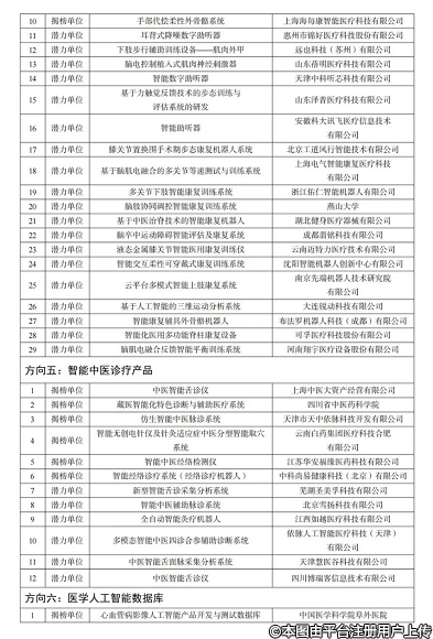 據(jù)悉,此次《入圍單位名單》涉及共八大方向,合計(jì)221項(xiàng),具體包括:1)智能輔助診斷產(chǎn)品;2)智能輔助治療產(chǎn)品;3)智能監(jiān)護(hù)與生命支持產(chǎn)品;4)智能康復(fù)理療產(chǎn)品;5)智能中醫(yī)診療產(chǎn)品;6)醫(yī)學(xué)人工智能數(shù)據(jù)庫;7)人工智能醫(yī)療器械臨床試驗(yàn)平臺(tái);8)人工智能醫(yī)療器械真實(shí)世界數(shù)據(jù)應(yīng)用平臺(tái)。其中,入圍單位分為“揭榜單位”和“潛力單位”兩類,“揭榜單位”為創(chuàng)新任務(wù)攻關(guān)主體,鼓勵(lì)“潛力單位”實(shí)施揭榜任務(wù)。
