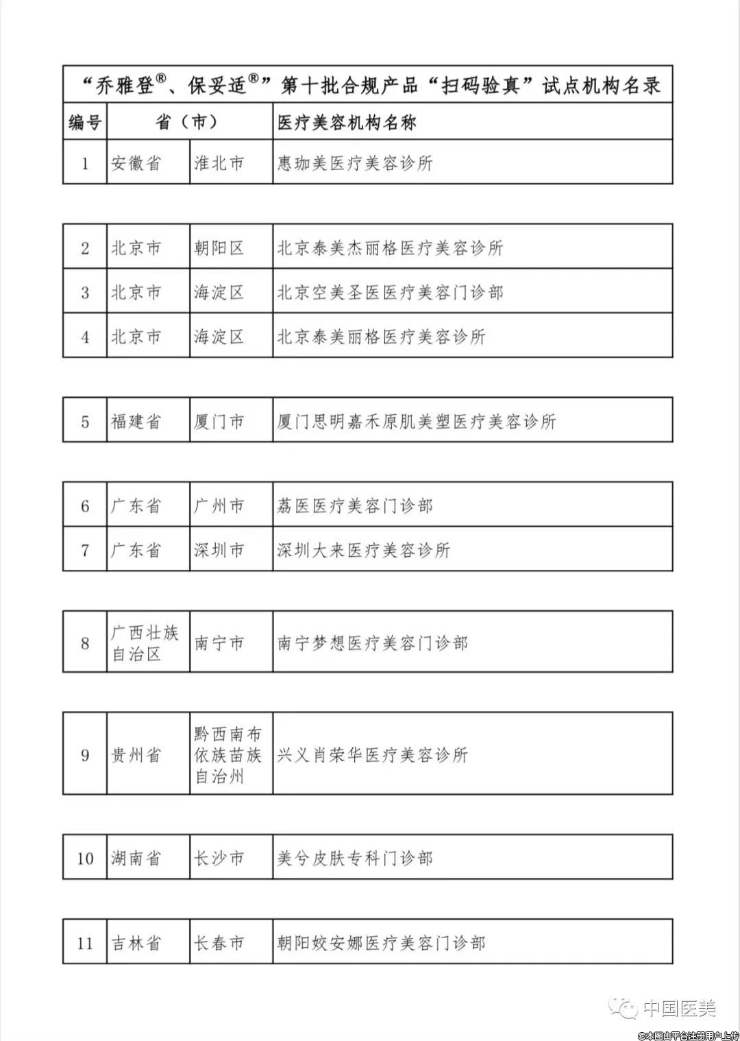根據(jù)《關(guān)于聯(lián)合醫(yī)療美容機(jī)構(gòu)開展合規(guī)產(chǎn)品“掃碼驗真”試點(diǎn)項目的通知》(中整協(xié)行監(jiān)委發(fā)[2022]1號)的工作安排,“中國醫(yī)美”行業(yè)監(jiān)督自律平臺聯(lián)合“喬雅登?”、“保妥適?”品牌方,開展合規(guī)產(chǎn)品“掃碼驗真”試點(diǎn)工作?,F(xiàn)公示10月1日至10月31日符合試點(diǎn)要求的第十批機(jī)構(gòu)名單,共計18家(詳見附件,按照省份拼音次序排序),也可登錄微信、微博醫(yī)美客戶端搜索“中國醫(yī)美”小程序,查詢名單及更多醫(yī)美行業(yè)合規(guī)信息。