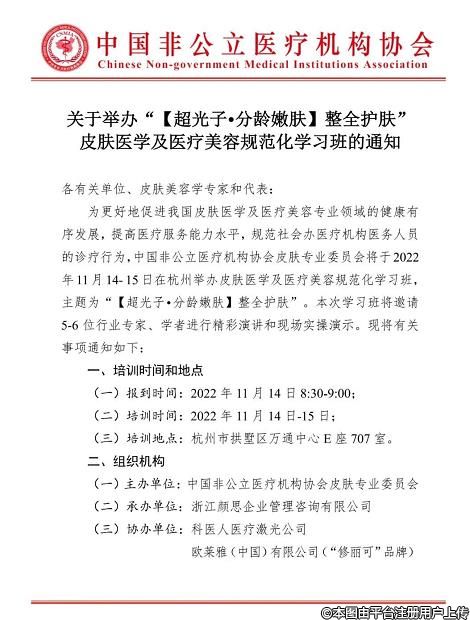 為更好地促進我國皮膚醫(yī)學及醫(yī)療美容專業(yè)領域的健康有序發(fā)展,提高醫(yī)療服務能力水平,規(guī)范社會辦醫(yī)療機構醫(yī)務人員的診療行為,中國非公立醫(yī)療機構協(xié)會皮膚專業(yè)委員會將于2022年11月14日-11月15日在杭州舉辦皮膚醫(yī)學及醫(yī)療美容規(guī)范化學習班,主題為“超光子 分齡嫩膚”整全護膚。本次學習班將邀請5-6位行業(yè)專家、學者進行精彩演講和現(xiàn)場實操演示。現(xiàn)將有關事項通知如下:
