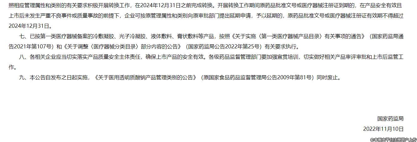 國(guó)家藥監(jiān)局關(guān)于醫(yī)用透明質(zhì)酸鈉產(chǎn)品管理類別的公告(2022年第103號(hào))