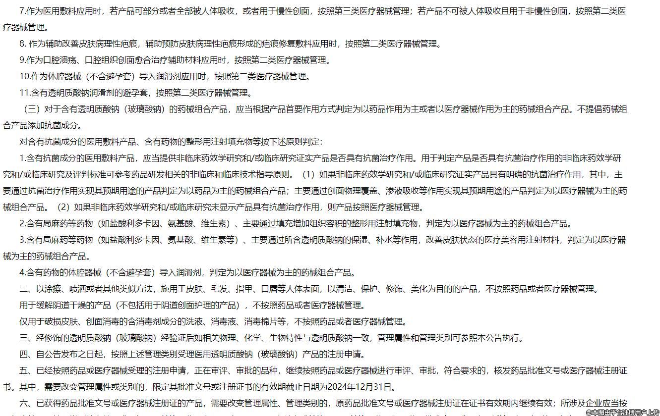 5、作為注射到真皮層,主要通過所含透明質(zhì)酸鈉的保濕、補(bǔ)水等作用,改善皮膚狀態(tài)應(yīng)用時(shí),按照第三類醫(yī)療器械管理。