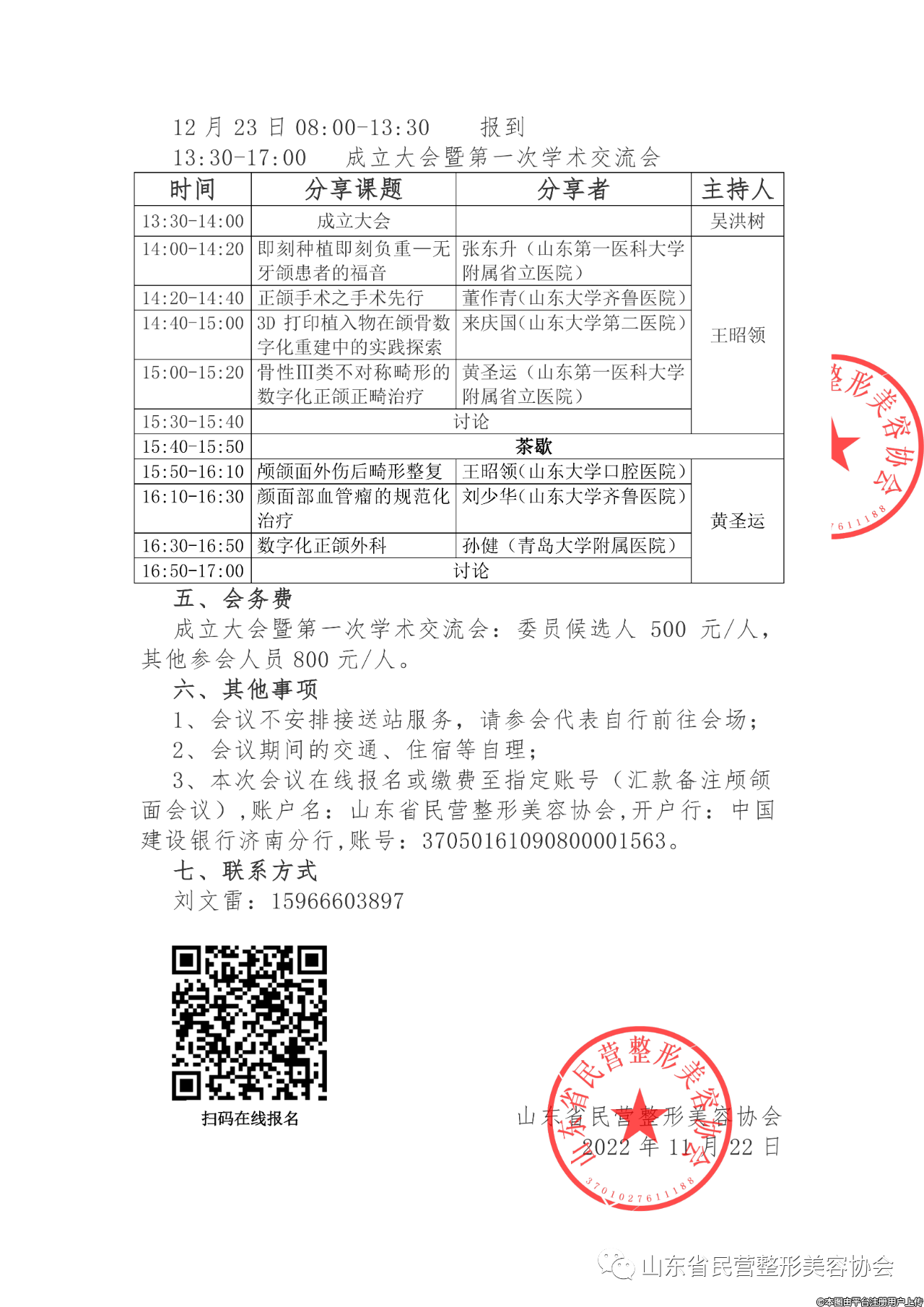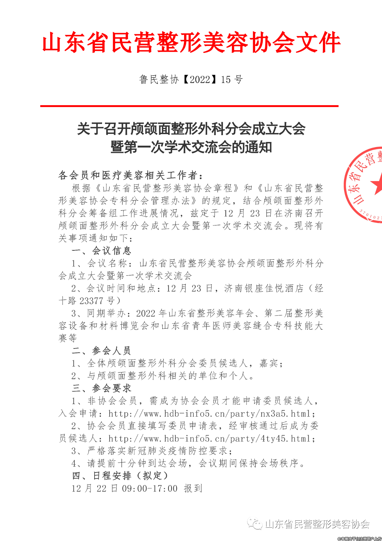 根據(jù)《山東省民營整形美容協(xié)會章程》和《山東省民營整形美容協(xié)會專科分會管理辦法》的規(guī)定,結(jié)合顱頜面整形外科分會籌備組工作進(jìn)展情況,茲定于12月23日在濟(jì)南召開顱頜面整形外科分會成立大會暨第一次學(xué)術(shù)交流會。現(xiàn)將有關(guān)事項通知如下: