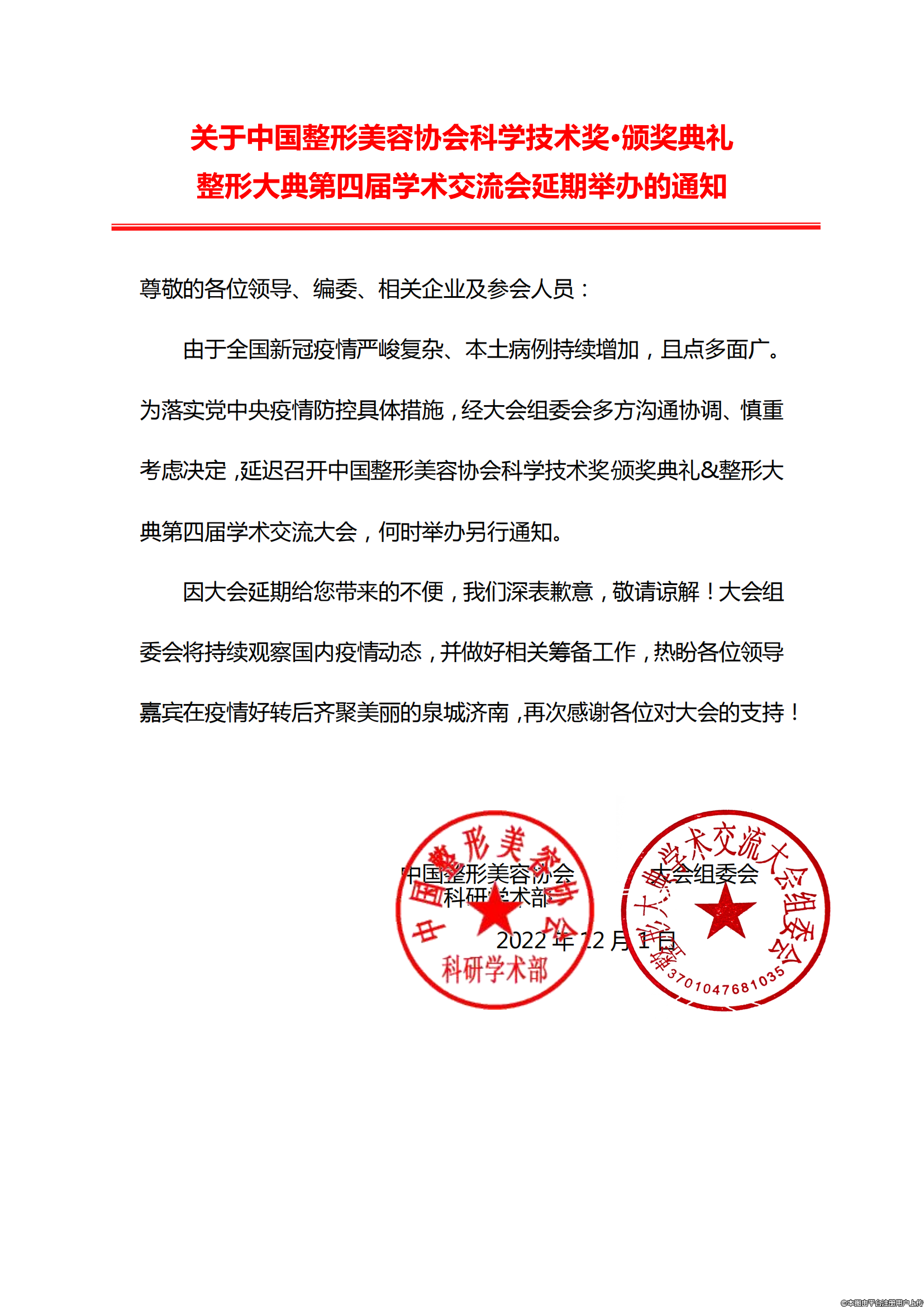 由于全國(guó)新冠疫情嚴(yán)峻復(fù)雜、本土病例持續(xù)增加,且點(diǎn)多面廣。為落實(shí)黨中央疫情防控具體措施,經(jīng)大會(huì)組委會(huì)多方溝通協(xié)調(diào)、慎重考慮決定,延遲召開(kāi)中國(guó)整形美容協(xié)會(huì)科學(xué)技術(shù)獎(jiǎng)?lì)C獎(jiǎng)典禮&整形大典第四屆學(xué)術(shù)交流大會(huì),何時(shí)舉辦另行通知。