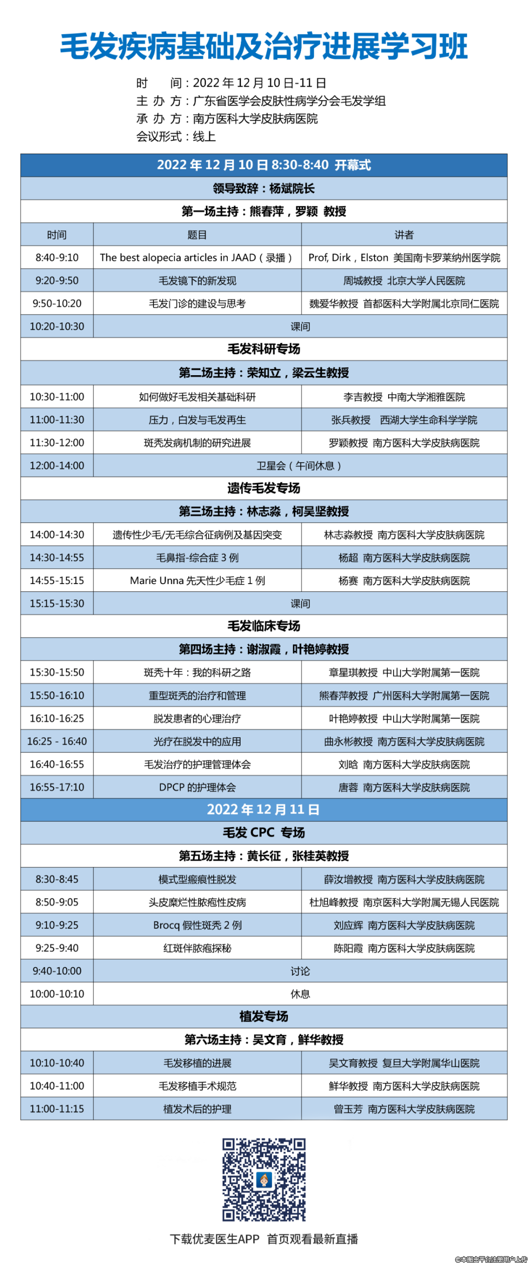 由廣東省醫(yī)學(xué)會皮膚性病學(xué)分會毛發(fā)組組織舉辦的2022年度毛發(fā)疾病診療進(jìn)展培訓(xùn)班,將于2022年12月10日由南方醫(yī)科大學(xué)皮膚病醫(yī)院承辦(項(xiàng)目編號:20224104122013(省))。屆時邀請來自國內(nèi)外多位毛發(fā)疾病專家從臨床和科研等多個方面授課,旨在提高皮膚科醫(yī)生對毛發(fā)疾病在臨床和病理方面的診療水平,歡迎從事皮膚病學(xué)業(yè)和美容醫(yī)學(xué)的醫(yī)生及學(xué)生參會。