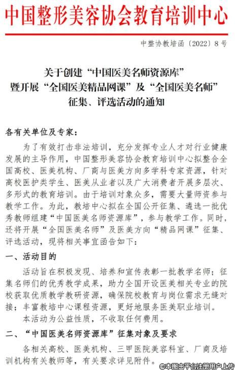 近日,中國整形美容協(xié)會教育培訓中心發(fā)布了關(guān)于創(chuàng)建“中國醫(yī)美名師資源庫”暨開展“全國醫(yī)美精品網(wǎng)課”及“全國醫(yī)美名師”征集、評選活動的通知,有意向參加活動的個人和單位請按文件要求及時進行推薦和申報。通知原文如下: