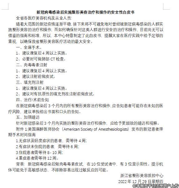 近日,浙江省就發(fā)布了新冠病毒感染后實(shí)施整形美容治療和操作的安全性白皮書。