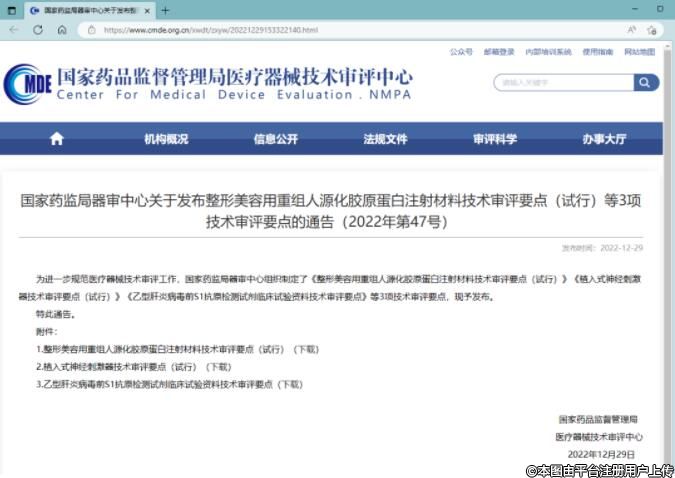 國家藥監(jiān)局器審中心發(fā)布整形美容用重組人源化膠原蛋白注射材料技術(shù)審評要點(diǎn)(試行)