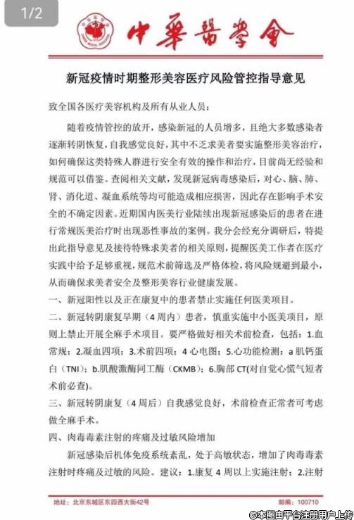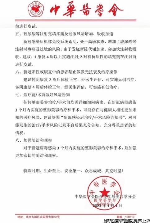 中華醫(yī)學(xué)會(huì)醫(yī)學(xué)美學(xué)與美容學(xué)分會(huì)消息,日前分會(huì)發(fā)布《新冠疫情時(shí)期整形美容醫(yī)療風(fēng)險(xiǎn)管控指導(dǎo)意見(jiàn)》稱,近期國(guó)內(nèi)醫(yī)美行業(yè)陸續(xù)出現(xiàn)新冠感染后的患者在進(jìn)行常規(guī)醫(yī)美治療時(shí)出現(xiàn)惡性事故的案例。