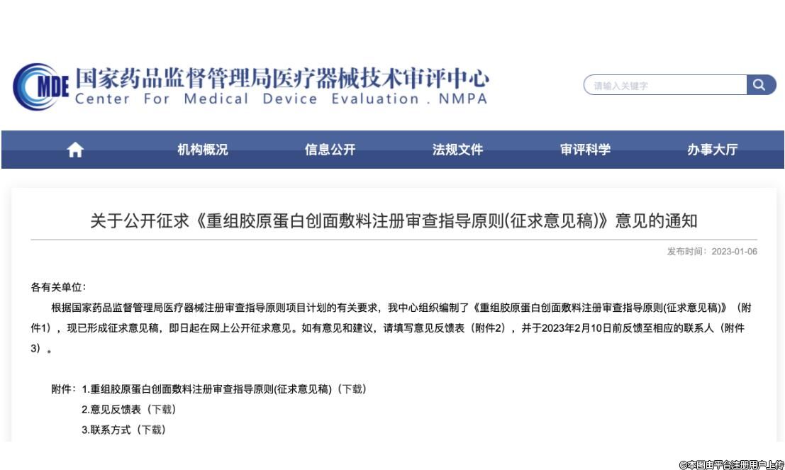 1月6日,CMDE對外公開征求《重組膠原蛋白創(chuàng)面敷料注冊審查指導(dǎo)原則(征求意見稿)》(以下簡稱“《指導(dǎo)原則(征求意見稿)》”)相關(guān)意見,以指導(dǎo)注冊申請人對重組膠原蛋白創(chuàng)面敷料注冊申報資料的準(zhǔn)備及撰寫,同時也為技術(shù)審評部門審查注冊申報資料提供參考。