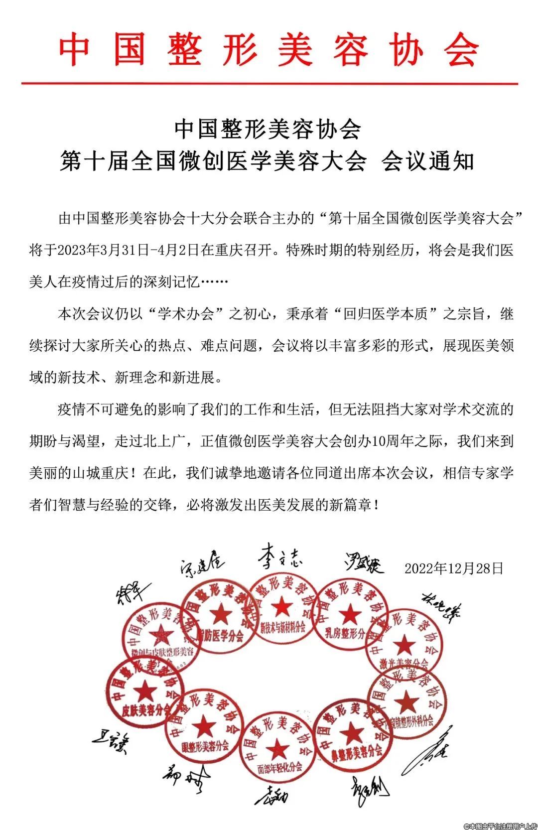 由中國整形美容協(xié)會十大分會聯(lián)合主辦的“第十屆全國微創(chuàng)醫(yī)學(xué)美容大會”將于2023年3月31日-4月2日在重慶召開。本次會議仍以“學(xué)術(shù)辦會”之初心,秉承著“回歸醫(yī)學(xué)本質(zhì)”之宗旨,繼續(xù)探討大家所關(guān)心的熱點(diǎn)、難點(diǎn)問題,會議將以豐富多彩的形式,展現(xiàn)醫(yī)美領(lǐng)域的新技術(shù)、新理念和新進(jìn)展。