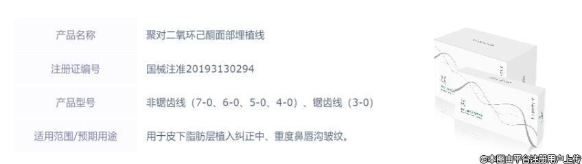 值得一提的,愛美客的“聚對二氧環(huán)己酮面部埋植線(商品名:TIGHTLY緊戀)”已于2019年5月獲得NMPA批準,成為國內(nèi)首張獲批上市的,用于皮下脂肪層植入糾正中、重度鼻唇溝皺紋的安全醫(yī)美材料。“TIGHTLY緊戀”是由聚對二氧環(huán)己酮制成的可吸收單股線,經(jīng)切割而成,染紫色,裝置于導入針當中,并采用固定模塊將外露線頭固定。其中3-0規(guī)格為鋸齒線,4-0以下規(guī)格為非鋸齒線,鋸齒線的鋸齒由刀具切割而成,均朝向同一方向。導入針座裝有手柄模塊。