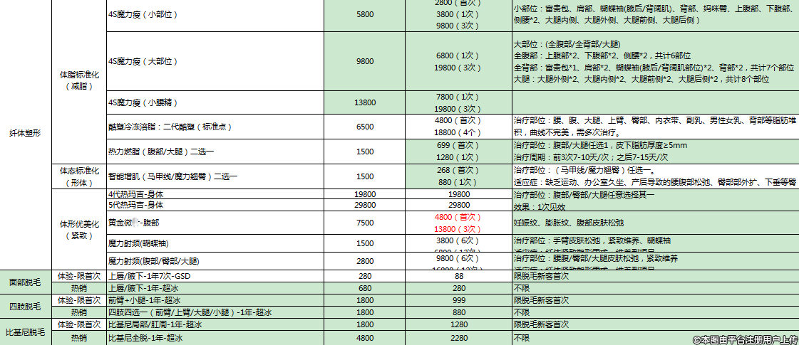 1、激光嫩膚:(1)飛頓光子嫩膚(DPL) 138;(2)M22光子嫩膚-全模式 380;(3)M22全模式+絲麗516 980;(4)AOPT超光子面部全模式 780;(5)AOPT全模式 +菲歐曼 980;(6)黑金超光子全模式 880;(7)黑金超光子全模式 + 絲麗516 1380