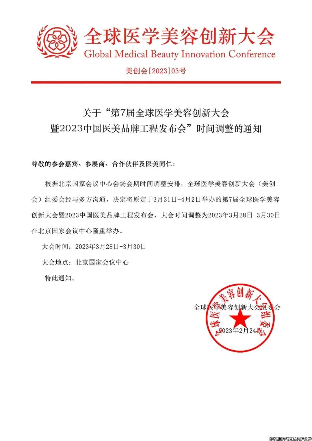 第七屆全球醫(yī)學(xué)美容創(chuàng)新大會暨2023中國醫(yī)美品牌工程發(fā)布會時間做了調(diào)整