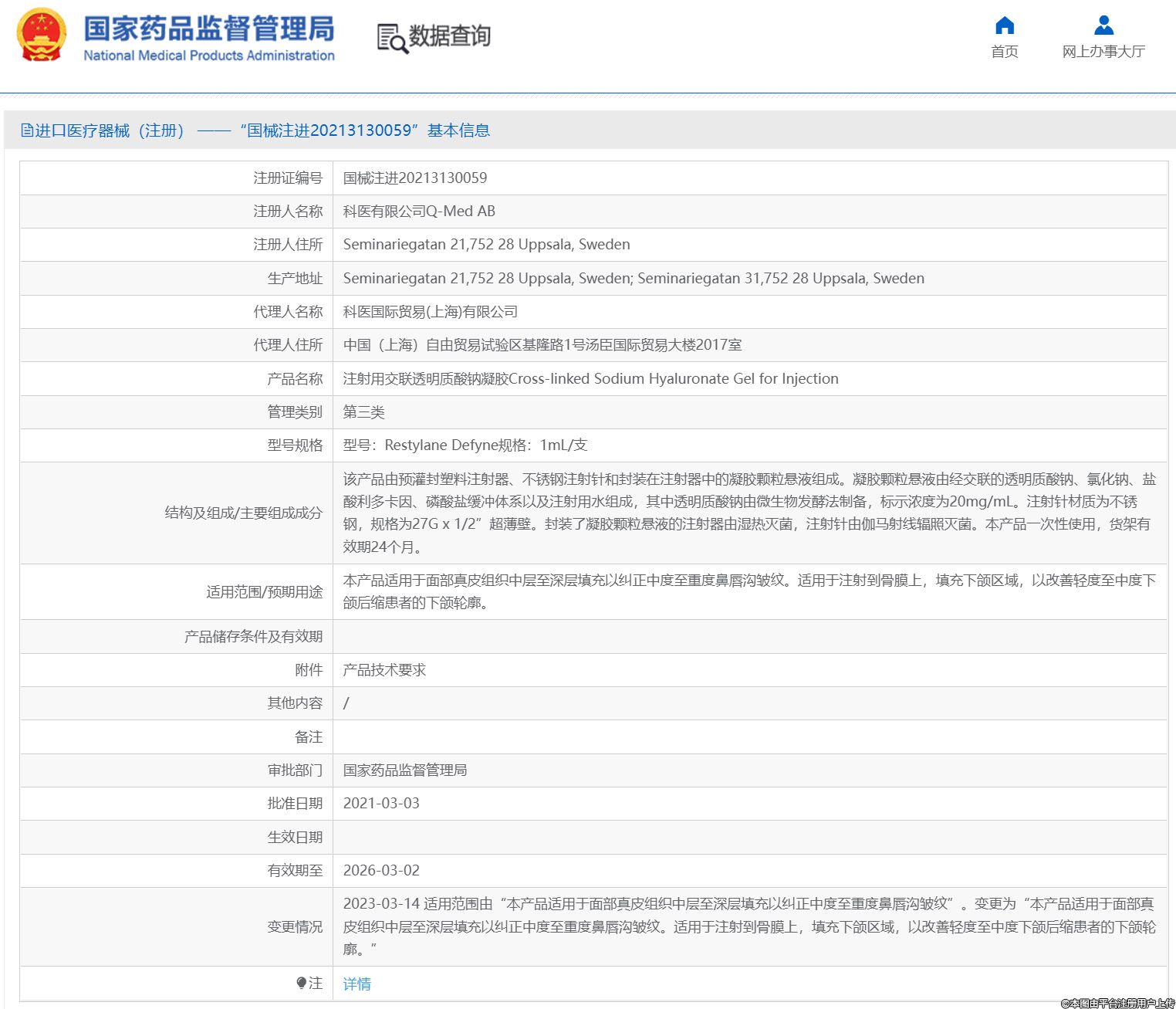 再來看另一個大家都熟知的品牌喬雅登,他們家在國內獲批的玻尿酸有:豐顏、緹顏、極致、雅致、質顏,其中質顏是國內首個用于唇部注射的玻尿酸產品;豐顏成為國內首個獲得國家藥品監(jiān)督管理局批準用于面頰部(含中面部)適應癥的玻尿酸填充劑。