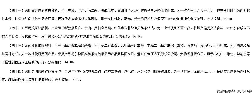 其中,約有涉及醫(yī)療美容領域的產(chǎn)品共計31款,如建議按照Ⅲ類醫(yī)療器械管理的一次性使用皮膚點刺針、無針注射器輔助推進等,建議按照Ⅱ類醫(yī)療器械管理醫(yī)用重組膠原蛋白敷料、醫(yī)用膠原貼敷料等。