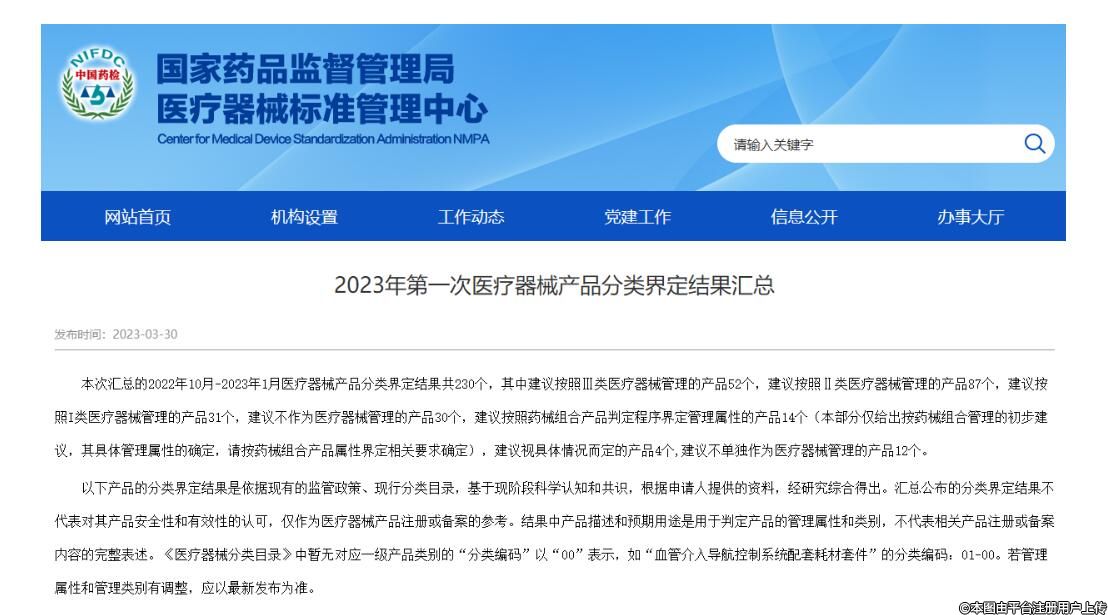 據(jù)介紹,本次醫(yī)療器械標準管理中心匯總的2022年10月-2023年1月醫(yī)療器械產(chǎn)品分類界定結果共230個,建議按照Ⅲ類醫(yī)療器械管理的產(chǎn)品52個;建議按照Ⅱ類醫(yī)療器械管理的產(chǎn)品87個;建議按照I類醫(yī)療器械管理的產(chǎn)品31個;建議不作為醫(yī)療器械管理的產(chǎn)品30個。此外還有建議按照藥械組合產(chǎn)品判定程序界定管理屬性的產(chǎn)品、建議不單獨作為醫(yī)療器械管理的產(chǎn)品等。