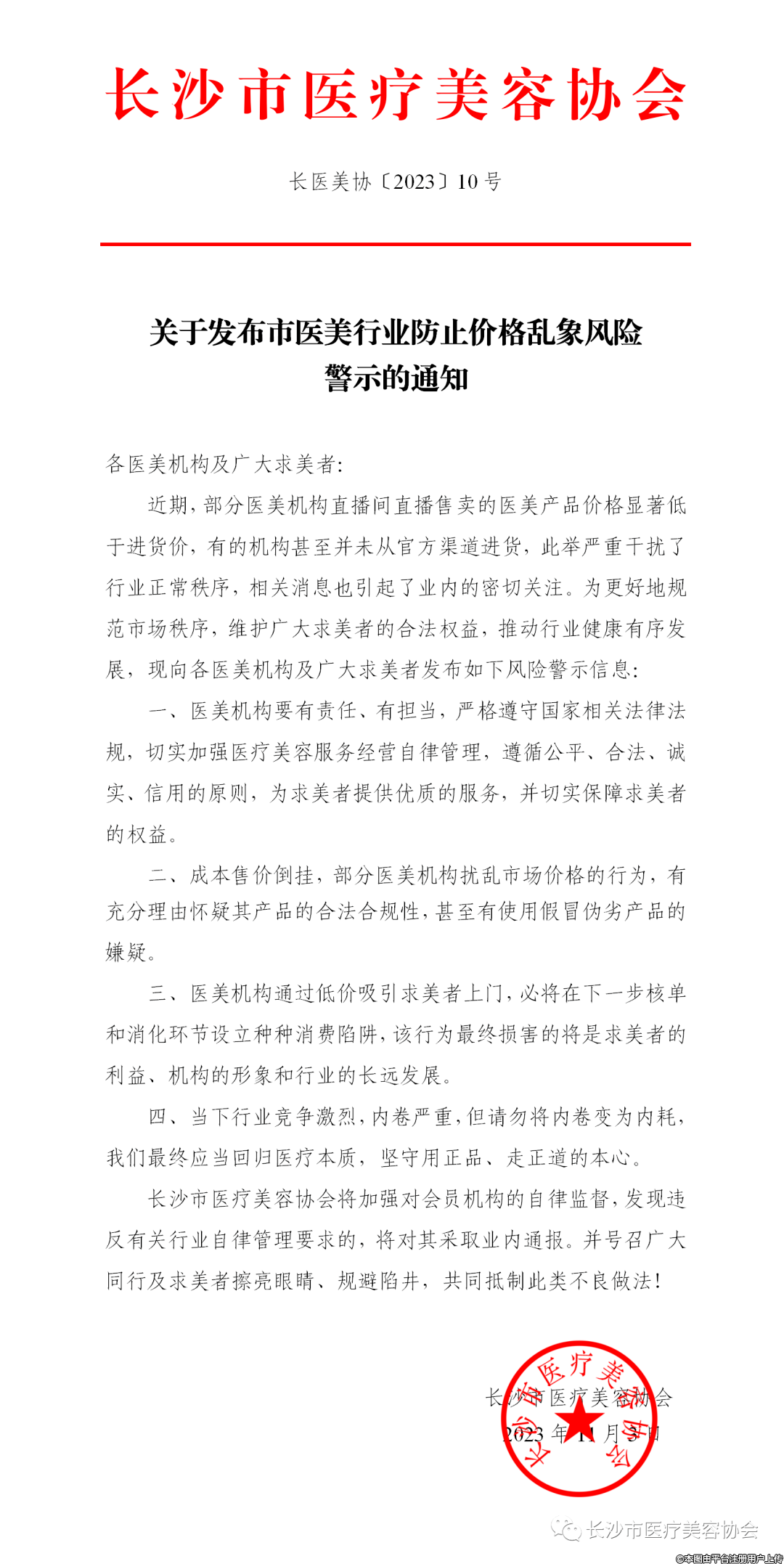 長(zhǎng)沙市醫(yī)療美容協(xié)會(huì)微信公眾號(hào)11月3日發(fā)布《關(guān)于發(fā)布市醫(yī)美行業(yè)防止價(jià)格亂象風(fēng)險(xiǎn)警示的通知》: