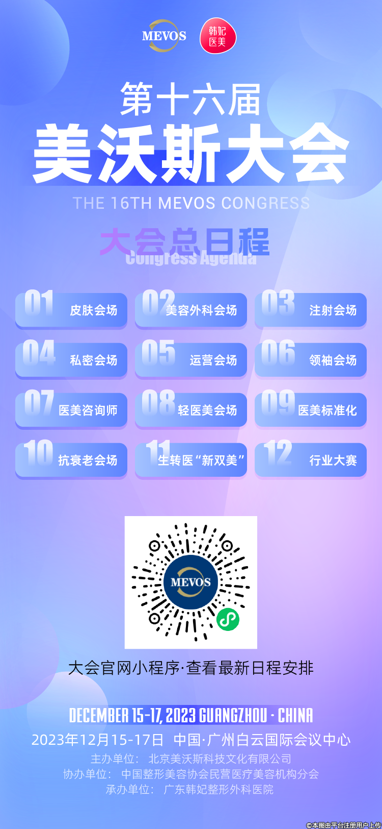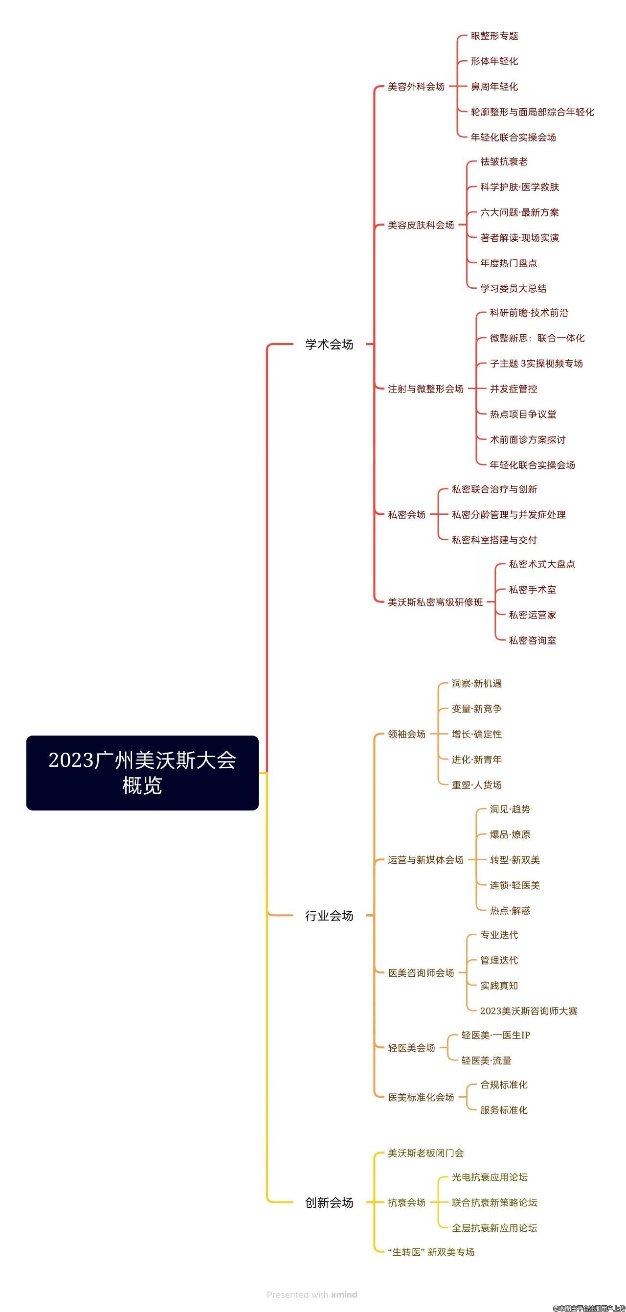 下面這張思維導圖,方便您一眼知大會全貌。大會的大框架沿襲了學術會場和行業(yè)會場;新增了一個創(chuàng)新會場,包含美沃斯老板閉門會、抗衰老會場、“生轉醫(yī)”新雙美專場;此外還創(chuàng)意性地增加了美沃斯跑團、美沃斯四城醫(yī)美足球聯(lián)賽活動。