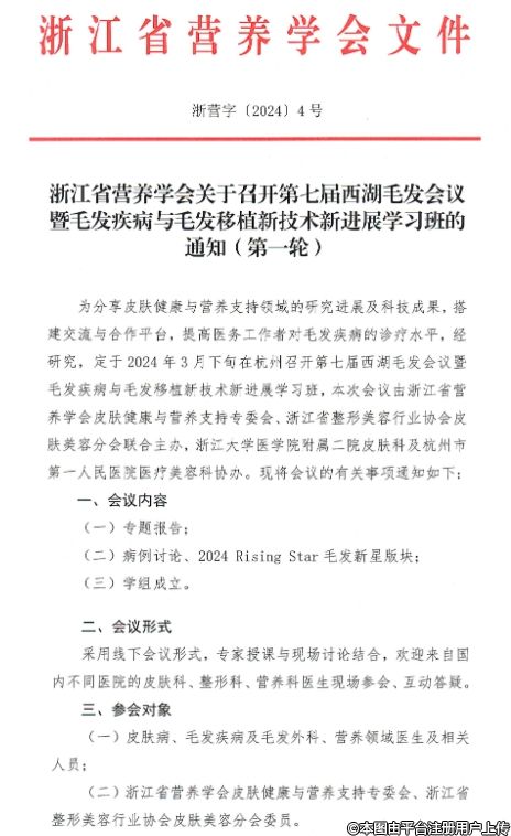 為分享皮膚健康與營養(yǎng)支持領(lǐng)域的研究進(jìn)展及科技成果,搭建交流與合作平臺(tái),提高醫(yī)務(wù)工作者對(duì)毛發(fā)疾病的診療水平,經(jīng)研究,定于2024年3月下旬在杭州召開第七屆西湖毛發(fā)會(huì)議暨毛發(fā)疾病與毛發(fā)移植新技術(shù)新進(jìn)展學(xué)習(xí)班,本次會(huì)議由浙江省營養(yǎng)學(xué)會(huì)皮膚健康與營養(yǎng)支持專委會(huì)、浙江省整形美容行業(yè)協(xié)會(huì)皮膚美容分會(huì)聯(lián)合主辦,浙江大學(xué)醫(yī)學(xué)院附屬二院皮膚科及杭州市第一人民醫(yī)院醫(yī)療美容科協(xié)辦。