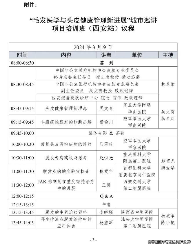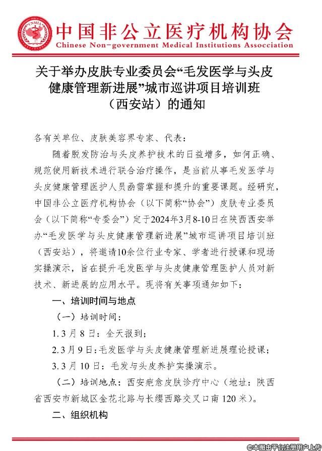隨著脫發(fā)防治與頭皮養(yǎng)護技術(shù)的日益增多,如何正確、規(guī)范使用新技術(shù)進行聯(lián)合治療操作,是當前從事毛發(fā)醫(yī)學(xué)與頭皮健康管理醫(yī)護人員凾需掌握和提升的重要課題。經(jīng)研究,中國非公立醫(yī)療機構(gòu)協(xié)會(以下簡稱“協(xié)會”)皮膚專業(yè)委員會(以下簡稱“專委會”)定于2024年3月8-10日在陜西西安舉辦“毛發(fā)醫(yī)學(xué)與頭皮健康管理新進展”城市巡講項目培訓(xùn)班(西安站),將邀請10余位行業(yè)專家、學(xué)者進行授課和現(xiàn)場實操演示,旨在提升毛發(fā)醫(yī)學(xué)與頭皮健康管理醫(yī)護人員對新技術(shù)、新進展的應(yīng)用水平?,F(xiàn)將有關(guān)事項通知如下:
