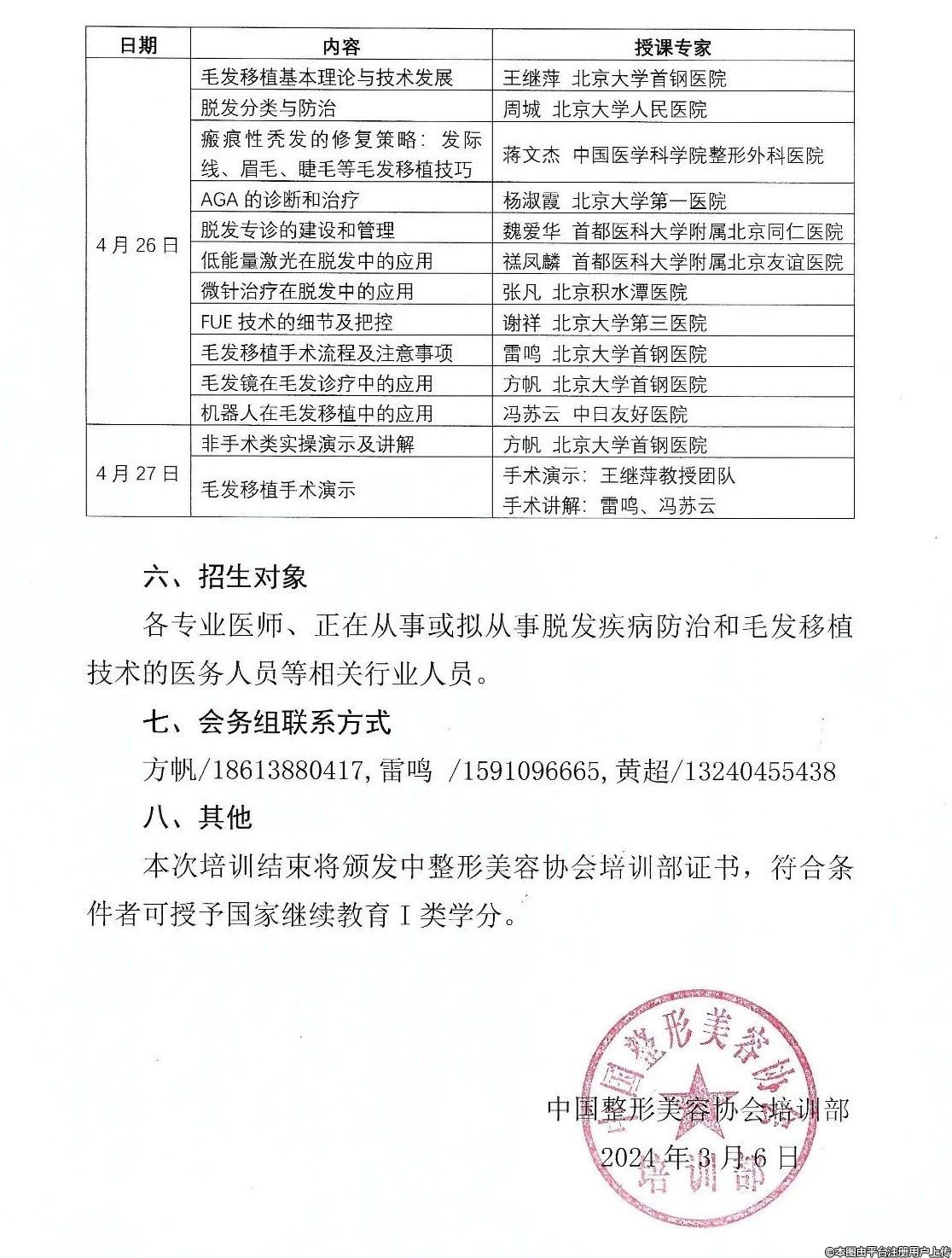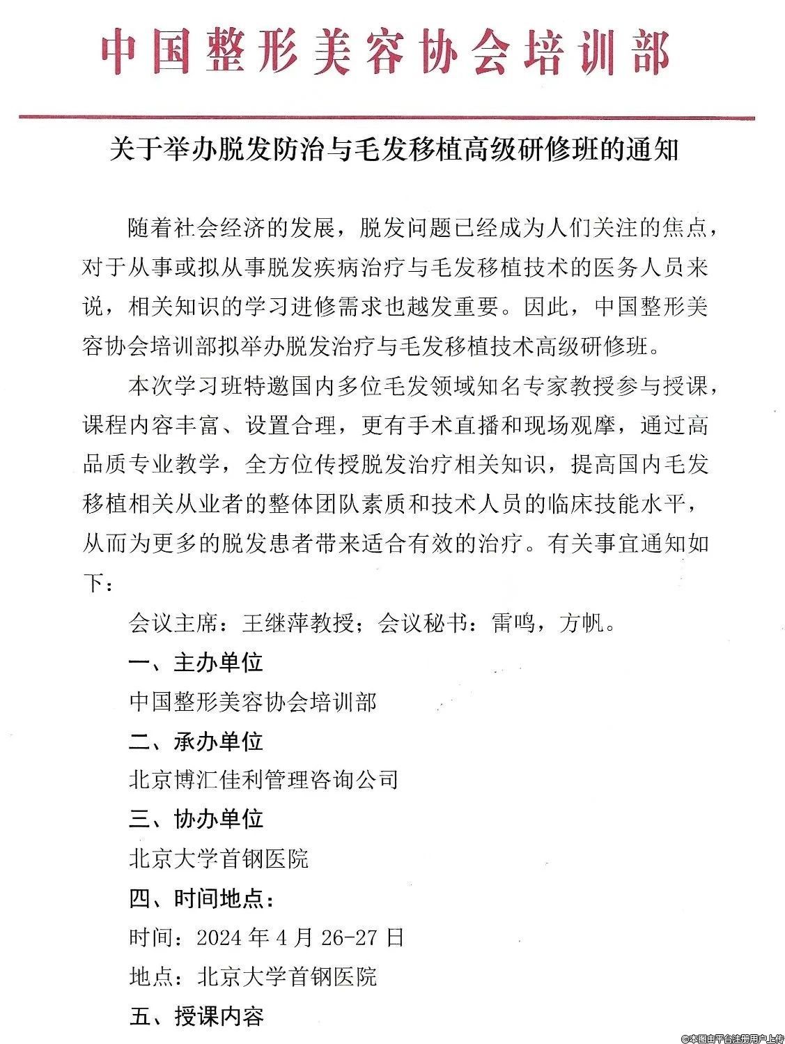 隨著社會(huì)經(jīng)濟(jì)的發(fā)展,脫發(fā)問(wèn)題已經(jīng)成為人們關(guān)注的焦點(diǎn),對(duì)于從事或擬從事脫發(fā)疾病治療與毛發(fā)移植技術(shù)的醫(yī)務(wù)人員來(lái)說(shuō),相關(guān)知識(shí)的學(xué)習(xí)進(jìn)修需求也越發(fā)重要。因此,中國(guó)整形美容協(xié)會(huì)培訓(xùn)部擬舉辦脫發(fā)治療與毛發(fā)移植技術(shù)高級(jí)研修班。
