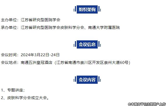 為全面提升江蘇省各級(jí)醫(yī)院皮膚科學(xué)專(zhuān)業(yè)醫(yī)療技術(shù)水平和服務(wù)質(zhì)量,健全江蘇省皮膚科醫(yī)師隊(duì)伍的建設(shè)和管理追蹤皮膚科學(xué)領(lǐng)域新進(jìn)展,擬于2024年3月22日-24日在南通五洲皇冠酒店召開(kāi)“皮膚科學(xué)分會(huì)第一屆年會(huì)暨皮膚科學(xué)分會(huì)成立大會(huì)”。本次會(huì)議將邀請(qǐng)全國(guó)皮膚科學(xué)領(lǐng)域的著名專(zhuān)家授課并召開(kāi)皮膚科學(xué)分會(huì)成立大會(huì)參會(huì)人員200人。歡迎皮膚科醫(yī)師參會(huì)。