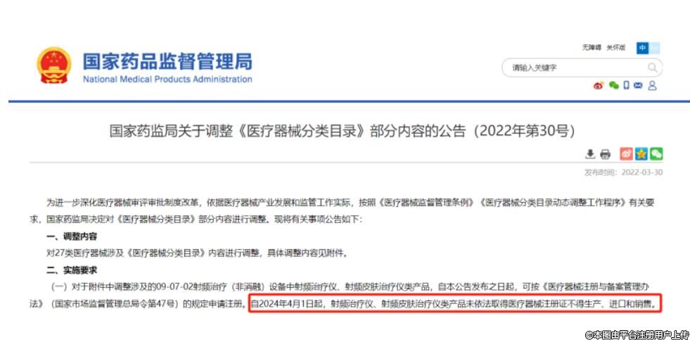 根據(jù)《國(guó)家藥監(jiān)局關(guān)于調(diào)整<醫(yī)療器械分類目錄>部分內(nèi)容的公告(2022年第30號(hào))》(以下簡(jiǎn)稱《公告》),4月1日起,射頻治療儀、射頻皮膚治療儀類產(chǎn)品作為第三類醫(yī)療器械管理,未依法取得醫(yī)療器械注冊(cè)證不得生產(chǎn)、進(jìn)口和銷售。