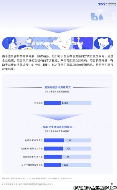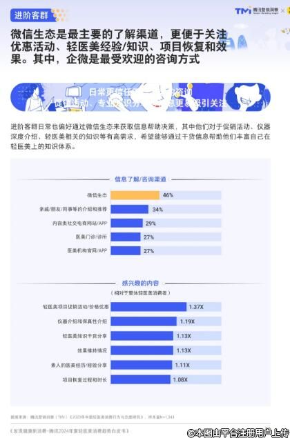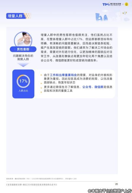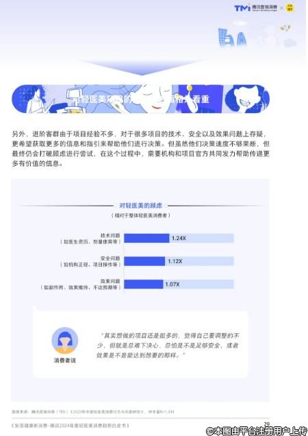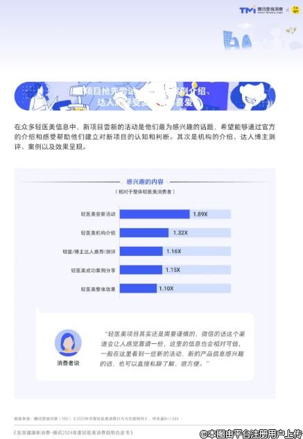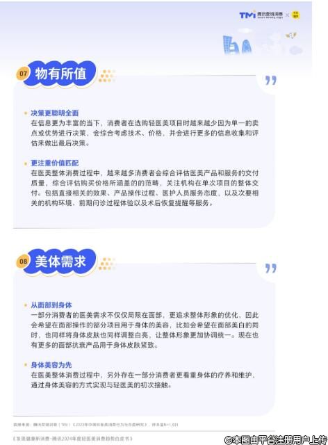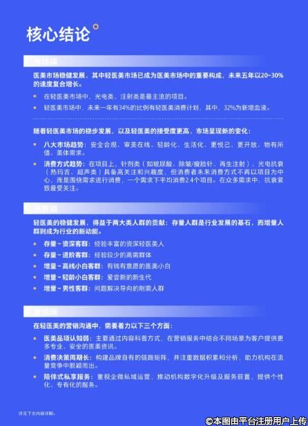 安全合規(guī)指求美者要驗(yàn)證機(jī)構(gòu)的背景、人員的資質(zhì)、產(chǎn)品的真?zhèn)蔚?。審美在線指求美者從于篇一律朝著自然個性轉(zhuǎn)變。輕齡化指求美者里年輕人比例增大,在全球也首屈一指。生活化指求美者會把更多舒適且有效的治療當(dāng)作更美好的生活方式。更悅己指求美者的需求驅(qū)動力開始來源于自我認(rèn)可和自我追求。更開放是求美者不再忌諱醫(yī)美,愿意分享醫(yī)美。物有所值指求美者不是只看價格,而是要看價值,價值匹配價格的項(xiàng)目才能打動他們。美體需求是求美者從面部美容到身體健康在延生,其中孕育著極大的新市場。