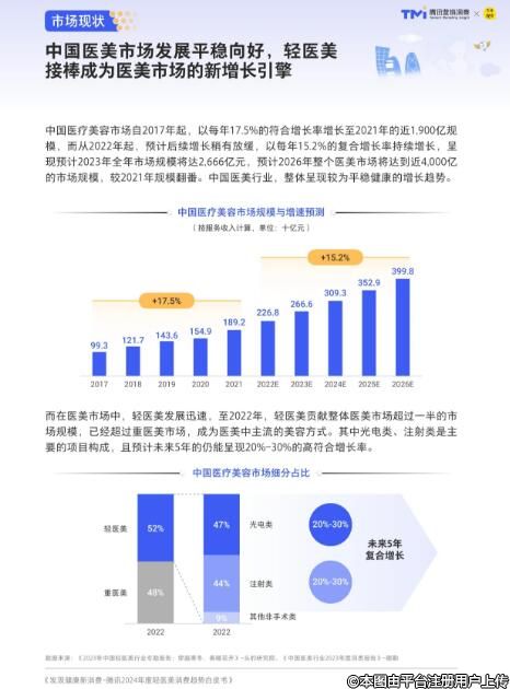 需要指出的是,現(xiàn)階段的輕醫(yī)美還不是完整的輕醫(yī)美?,F(xiàn)階段輕醫(yī)美,以注射美容、光電設(shè)備抗衰美容、水光針為主;而完整的輕醫(yī)美,還應(yīng)該包括醫(yī)美皮膚管理、醫(yī)美形體管理,以及抗衰之外的多種皮膚問題解決。