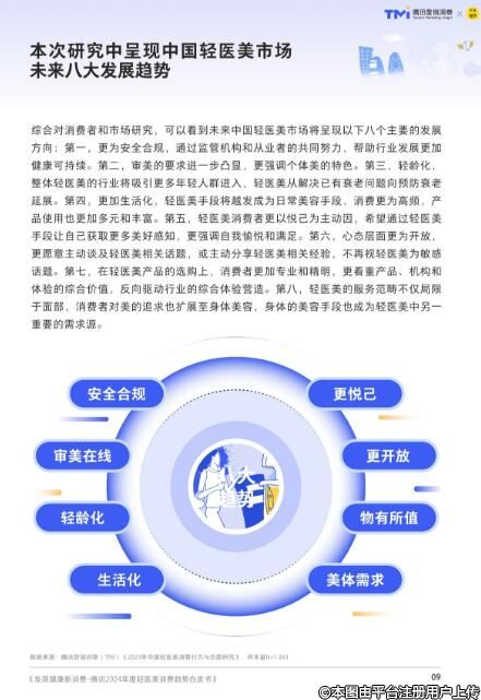 中國輕醫(yī)美未來發(fā)展八大發(fā)展趨勢包括:安全合規(guī)、審美在線、輕齡化、生活化、更悅己、更開放、物有所值、美體需求。