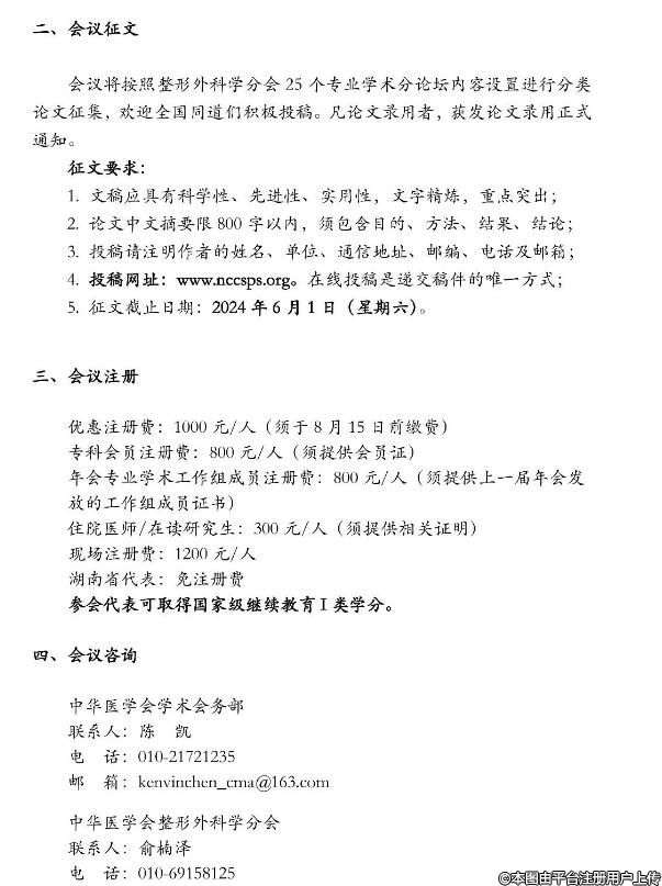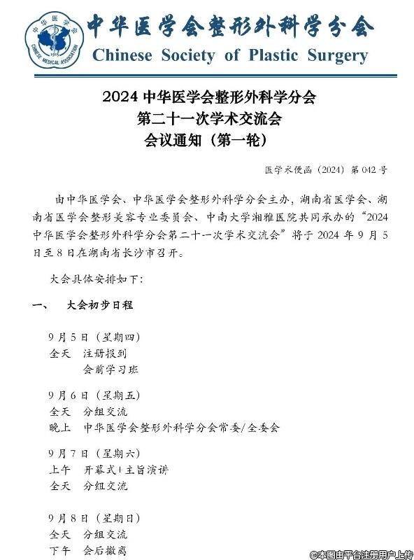 由中華醫(yī)學(xué)會(huì)、中華醫(yī)學(xué)會(huì)整形外科學(xué)分會(huì)主辦,湖南省醫(yī)學(xué)會(huì)、湖南省醫(yī)學(xué)會(huì)整形美容專業(yè)委員會(huì)、中南大學(xué)湘雅醫(yī)院共同承辦的“2024中華醫(yī)學(xué)會(huì)整形外科學(xué)分會(huì)第二十一次學(xué)術(shù)交流會(huì)”將于2024年9月5日至8日在湖南省長沙市召開。